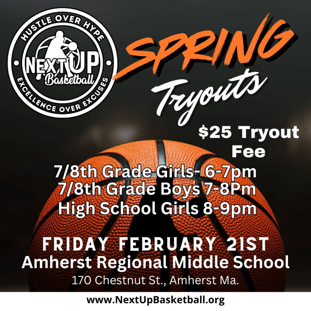 Posted on February 10, 2025 by benjaminherrington To sign up Click Here To pay tryout fee Click Here For more info: Text: 413-345-2938 Email: nextupbasketball413@gmail.com Share this: Click to share on X (Opens in new window) X Click to share on Facebook (Opens in new window) Facebook Like Loading...